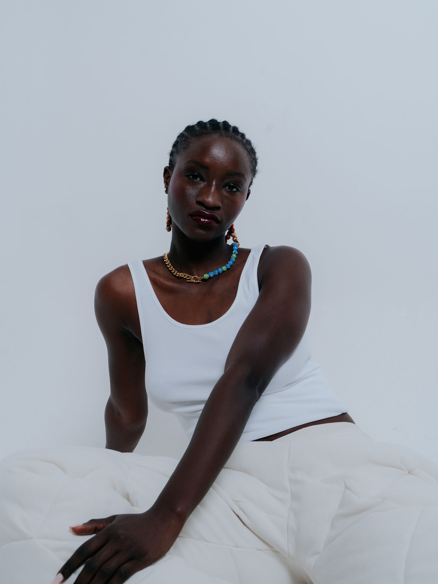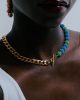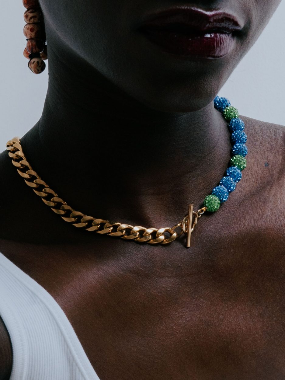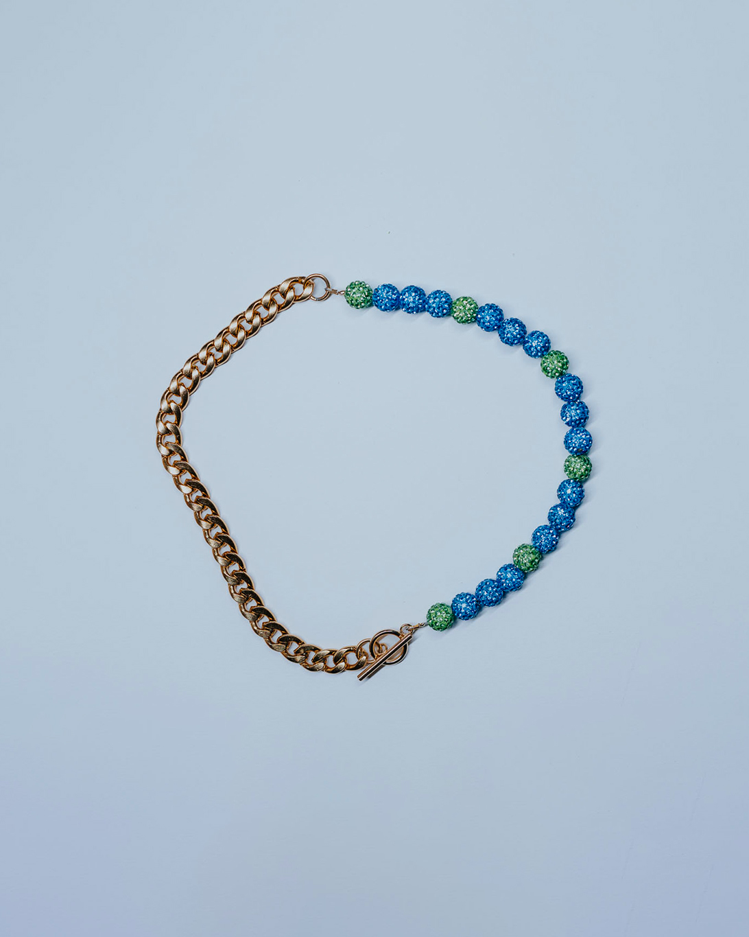 Le collier Émeraude s’inspire des mystères des profondeurs marines, où les reflets bleus et verts se mêlent en une danse scintillante. Porté tel un talisman, il évoque la sérénité des vagues et la richesse des trésors cachés sous l’eau.