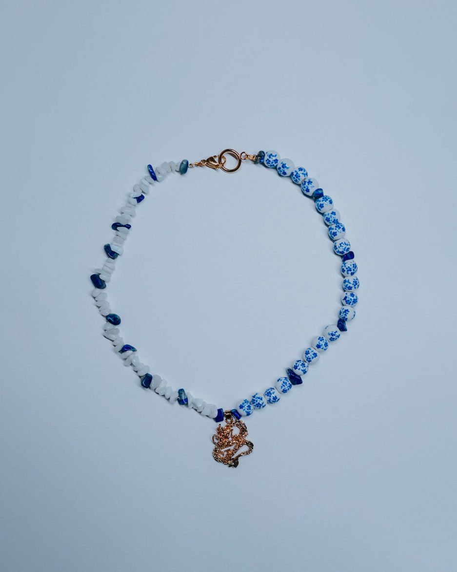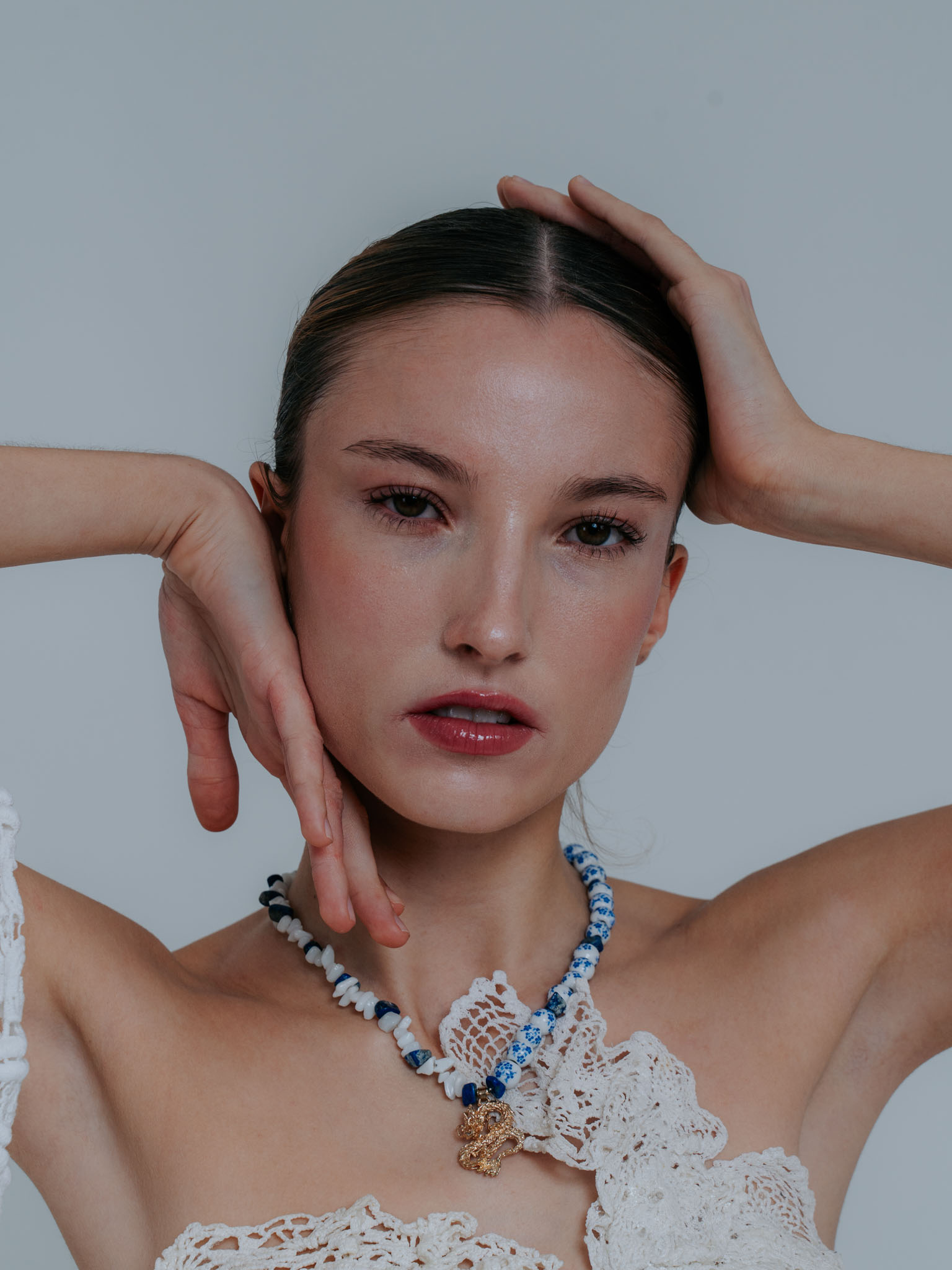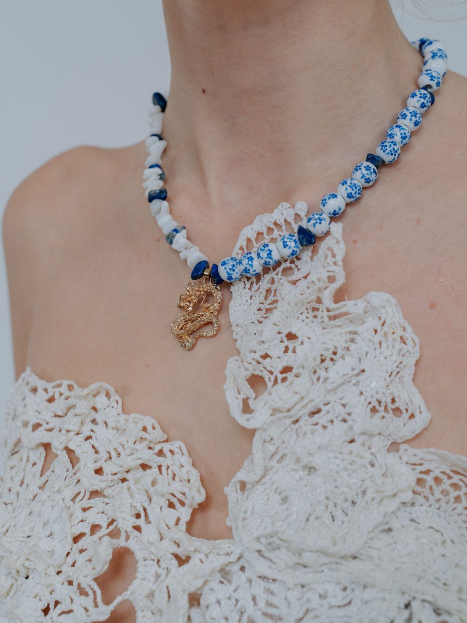 Le collier Porcelaine capture l’élégance délicate de la céramique fine, inspiré par les motifs intemporels des porcelaines antiques. Ses perles blanches et ses détails raffinés évoquent la beauté fragile et la grâce des objets précieux, apportant une touche d’élégance douce à celui qui le porte.