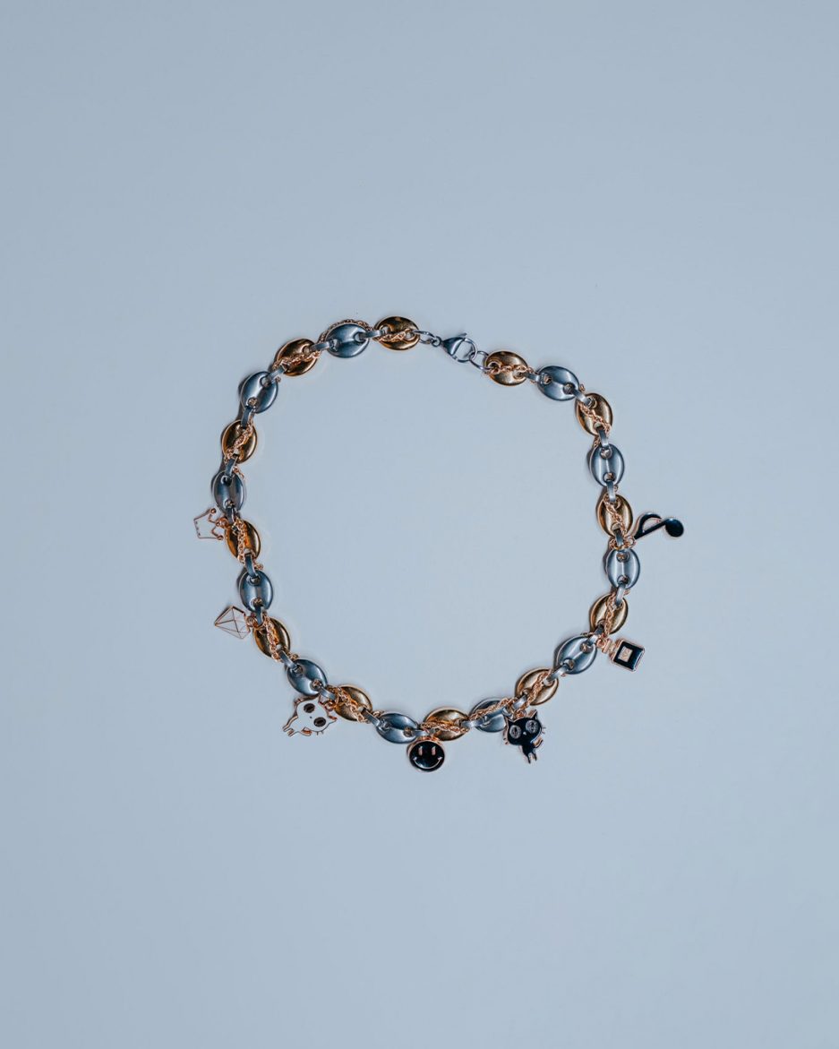 Matériaux : Chaîne en acier inoxydable doré et argenté / 7 pendentifs blancs et noirs